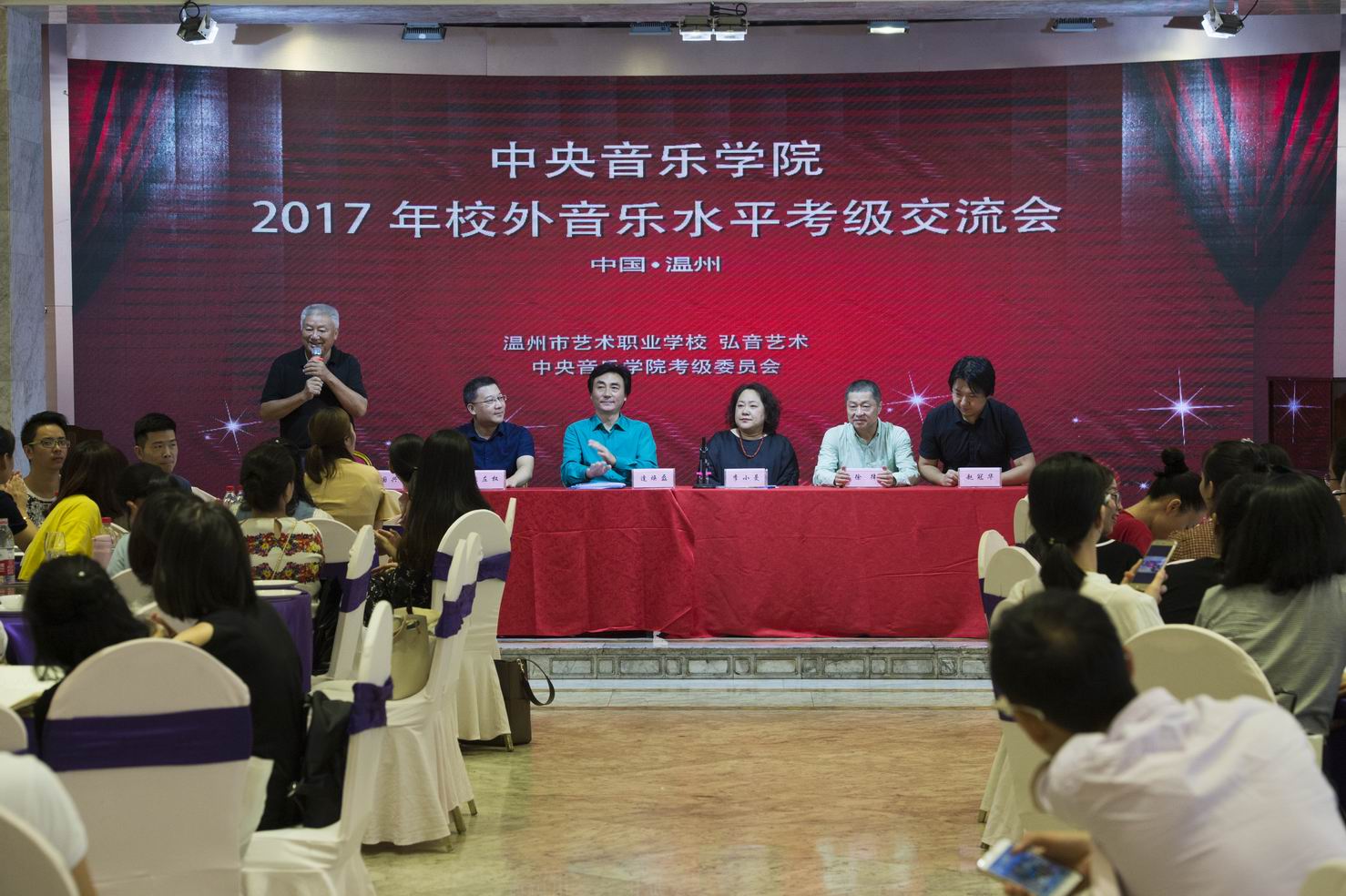 2017年10月7日中央音乐学院校外音乐水平考级(温州)交流会在温州金谷大酒店隆重召开,280多名温州地区的音乐教师和专业人士莅临会场。中央音乐学院党委副书记、考级委员会常务副主任逄焕磊、秘书长李小曼、专业助理张左权、徐律、赵冠华等老师来温参加了会议,与温州的音乐专业教师们见面交流。