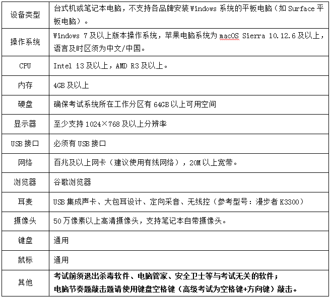 1.设备要求:考试支持计算机、Pad和手机3种设备类型,考生根据自身情况自备考试设备(至少1种),设备具体要求如下